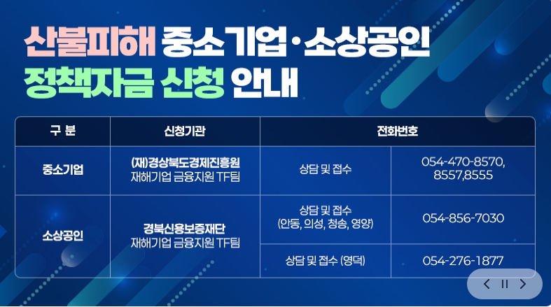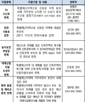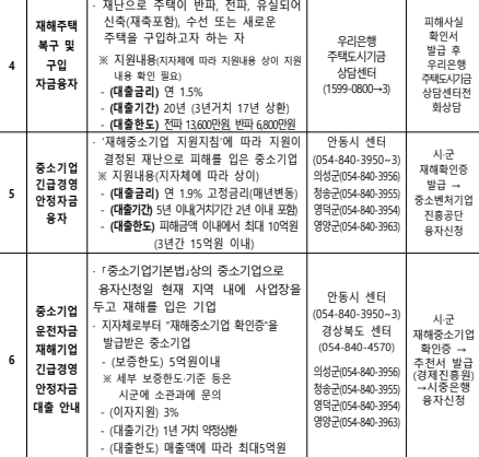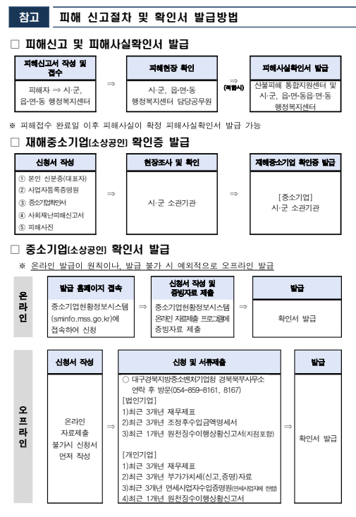 - 소상공인: 피해시설 복구자금 저리 융자, 이자차액 보전