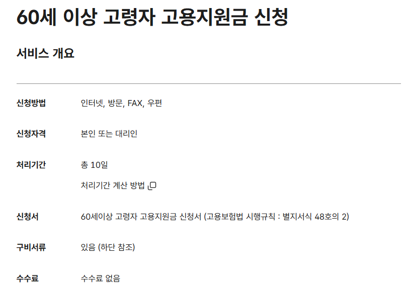 - 고용노동부 고객상담센터: 1350 (고령자고용지원금 전담)