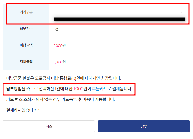 후불카드를 선택해야만 고속도로 통행료 홈페이지에서 민자고속도로 미납 통행료를 결제할 수 있다는 사실