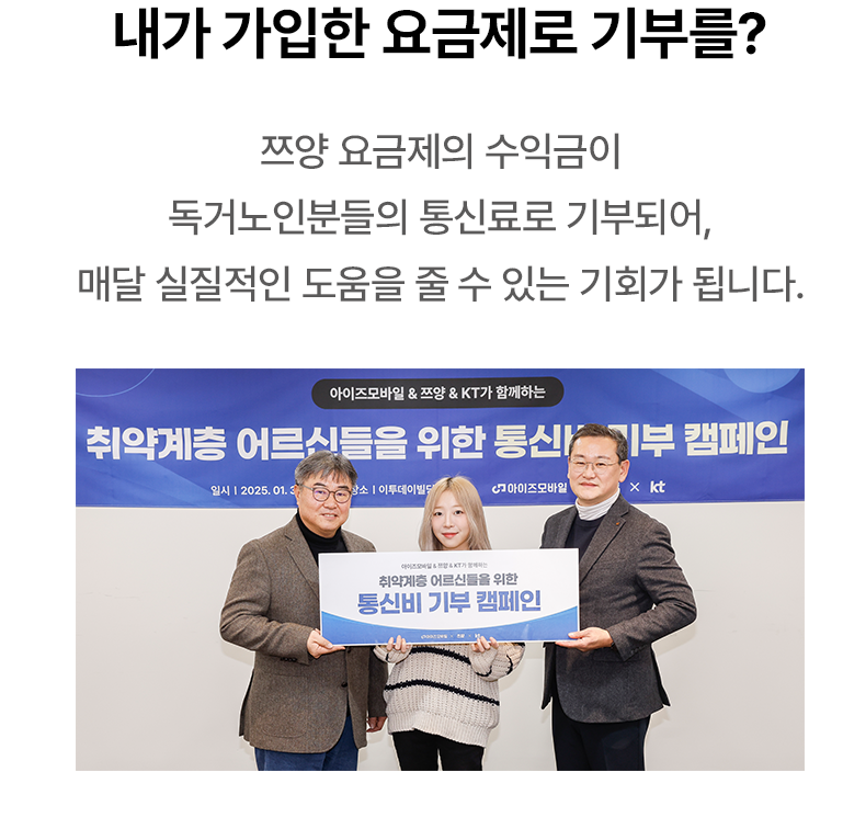 아이즈모바일에서는 '쯔양 기부요금제'를 통해 요금제 수익금 일부를 취약계층 어르신의 통신비로 기부하는 캠페인을 진행하고 있습니다.