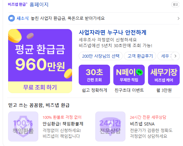 비즈넵 환급 신청은 국세청과 연동되어 자동으로 자료를 분석하고, 세무사가 환급 가능 여부를 알려주는 구조입니다.