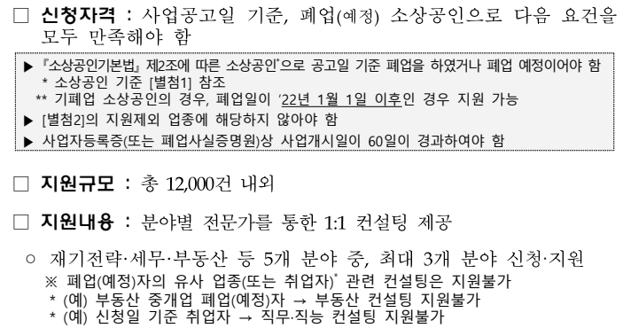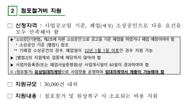 - 폐업 시기: 공고일 기준 폐업 예정이거나 이미 폐업한 경우(기폐업자는 2022년 1월 1일 이후 폐업한 경우)