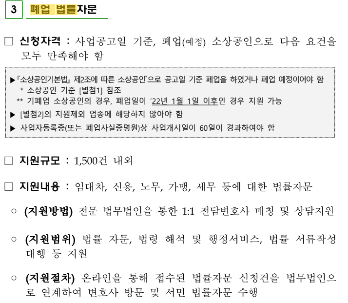 - 폐업 법률자문: 폐업 관련 법률상담 외 개인 민사(이혼, 증여 등) 자문은 지원 제외