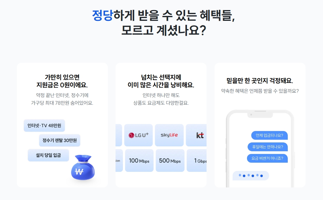 신청부터 설치까지 빠르고 간편하게, 그리고 비교 견적 없이도 최저가 보장되는 점이 가장 큰 장점입니다.