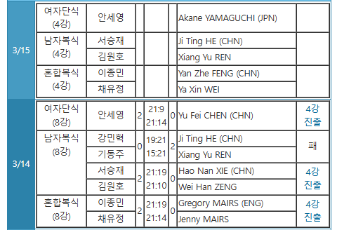 | 전영오픈 여자 단식 4강 | 2025년 3월 16일 (한국시간 기준) | SPOTV, 네이버 스포츠 |
