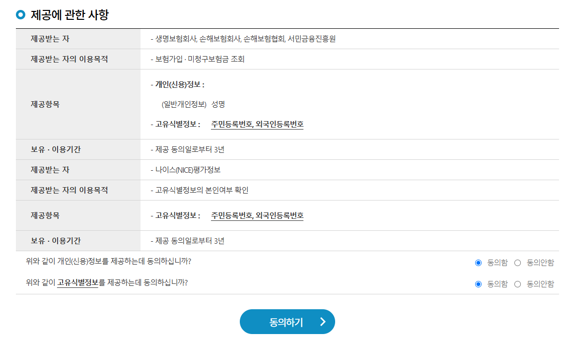 - 가족 보험 조회: 배우자, 부모, 자녀 보험을 조회하려면 추가 동의 절차가 필요합니다.