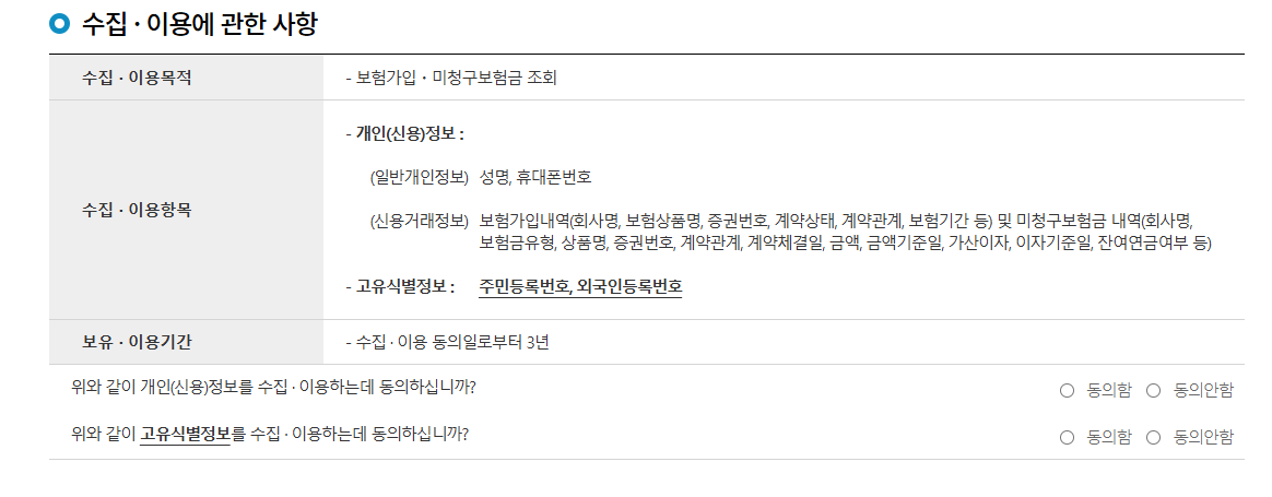 - 미청구 보험금 확인: 청구하지 않은 보험금, 만기 환급금을 찾아낼 수 있습니다.