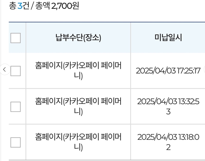 분명 조회했을 때는 4건/3,700원을 납부해야 되는데, 실제 모두 체크했지만 3건/2,700원이 결제되었습니다.