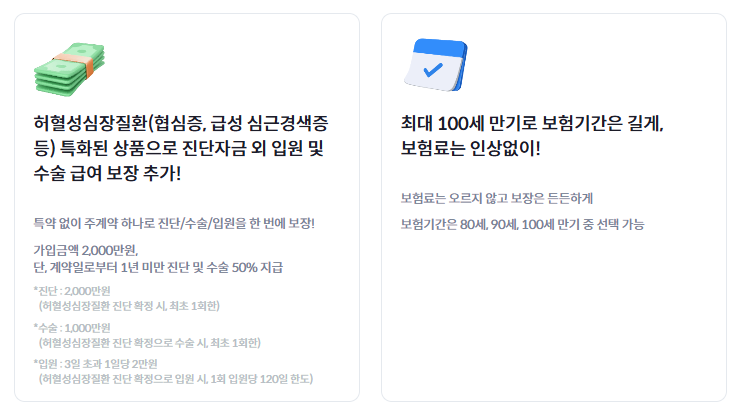 - ✅ 심장질환 보험: 진단 시 고액 일시금 지급 → 치료·생활비 자유롭게 사용 가능