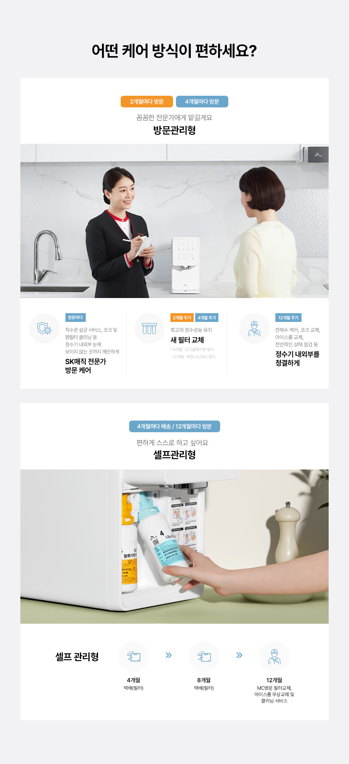 SK매직 정수기는 방문관리형과 셀프관리형을 선택할 수 있어요.