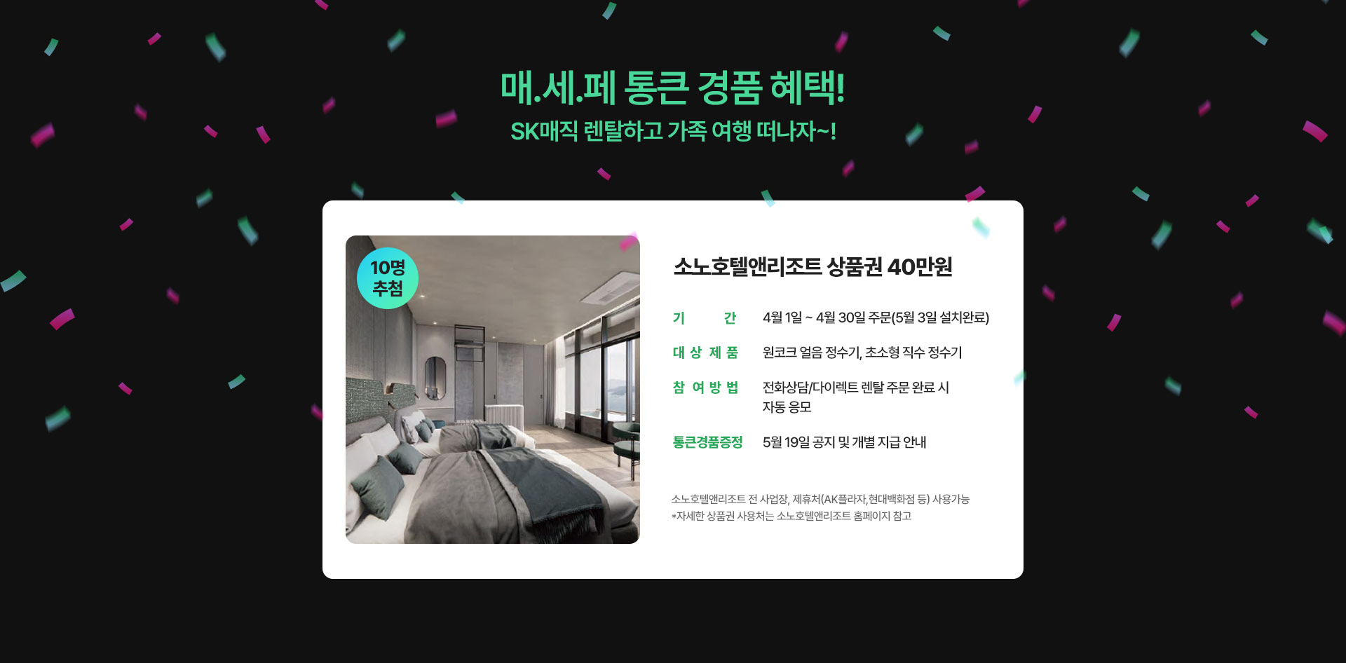 2025년 4월 한 달간 진행되는 ‘매세페’ 이벤트에서는 최대 12개월 무료 렌탈과 프리미엄 사은품 100% 증정, 소노호텔 숙박권 이벤트까지 놓치기 아까운 혜택이 가득합니다.