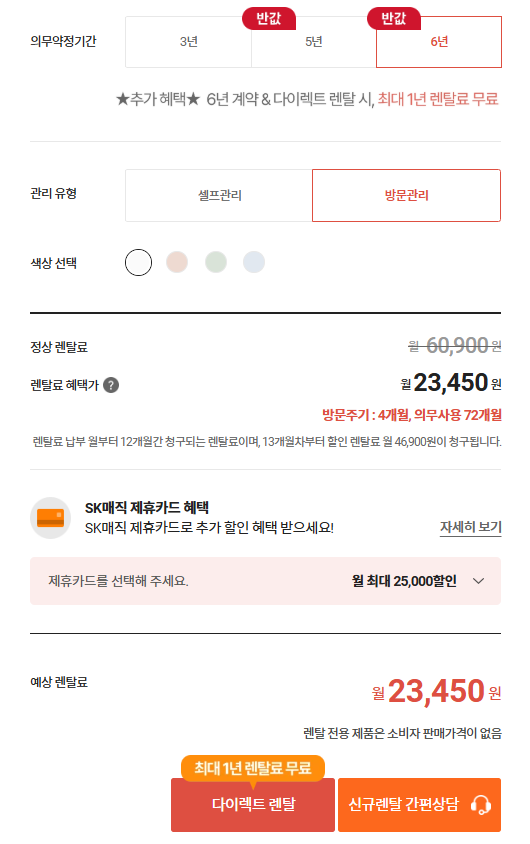 - 원하는 정수기 상품 페이지에서 다이렉트 렌탈 클릭