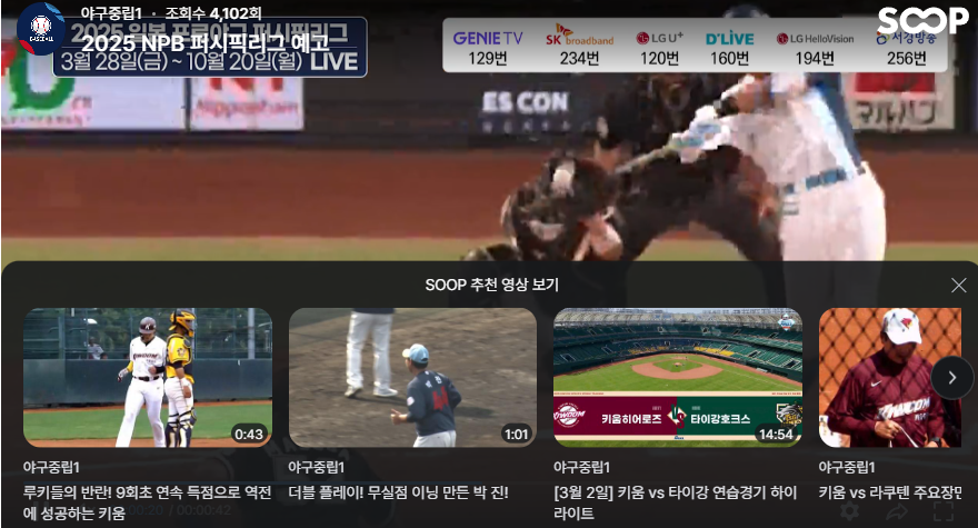 👉 👉 SOOPTV 공식 일본야구 중계 구독